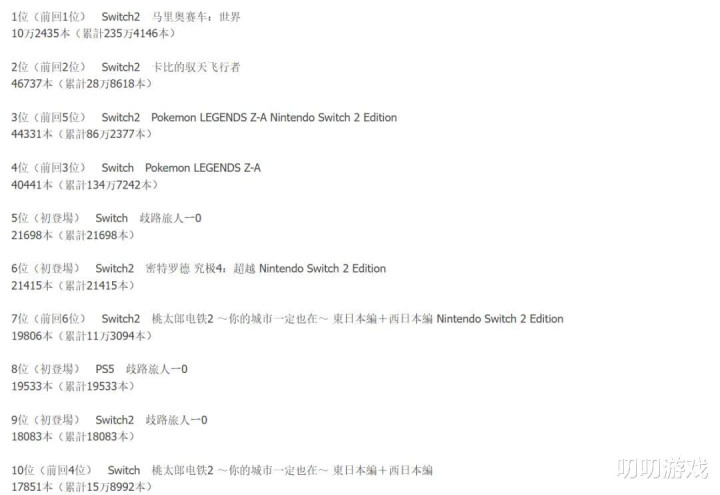 大家好,欢迎来到周末资讯。 在12月1日至12月7日的新一周Fami通销量榜上,《马里奥赛车:世界》以10万的销量再次获得冠军,这是它第16次获得销量版冠军了,太可怕了。 新作销量最高的是《歧路旅人0》,虽然没能进入前三,但其NS、NS2和PS5三版本加起来销量接近6万套,实际上已经超过了亚军《星之卡比:飞天骑士》的销量。