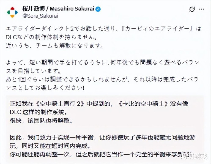 《星之卡比:飞天骑士》做为第一方NS2游戏,以其优秀的游戏性和热闹的氛围,获得了玩家的认可。 12日,游戏更新了1.2.0版本,修复了多处问题,增加了新功能,和进行了平衡性调整。 制作人樱井政博紧接着发文称,《星之卡比:飞天骑士》没有DLC计划,开发团队近期会解散。